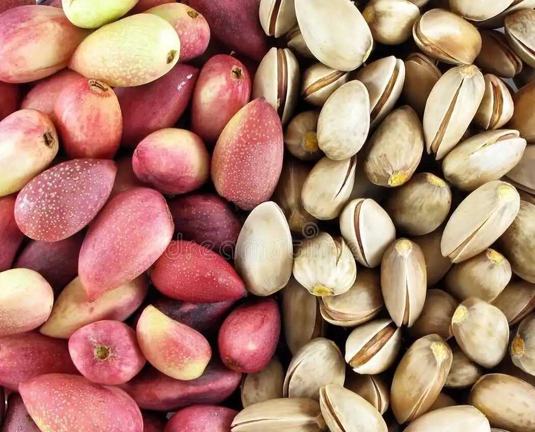成熟带皮的开心果和去掉果皮后带壳的开心果(图片:网络)