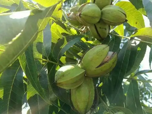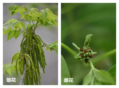 美国山核桃(Carya illinoinensis)俗名:薄壳山核桃、碧根果。原产北美洲,属于胡桃科山核桃属。“碧根果”这个词音译自“pecan”,来源于美国土著印第安语。碧根果属于大乔木,高可达50米,胸径可达2米,树皮粗糙,深纵裂。叶互生,奇数羽状复叶,卵状披针形至长椭圆状披针形、有时成长椭圆形,叶边缘锯齿状。花是雌雄同株异花,雄花是许多朵小花长在一根肉质的轴上,形状像个毛毛虫,脱落的时候是整根落,这种花序叫做葇荑花序,雌花序是3—10朵雌花组成的穗状花序,没有花瓣,短小而不起眼。碧根果的花颜值不高,很难吸引到专门的授粉昆虫,但它胜在花粉多,靠风传播,以量取胜。