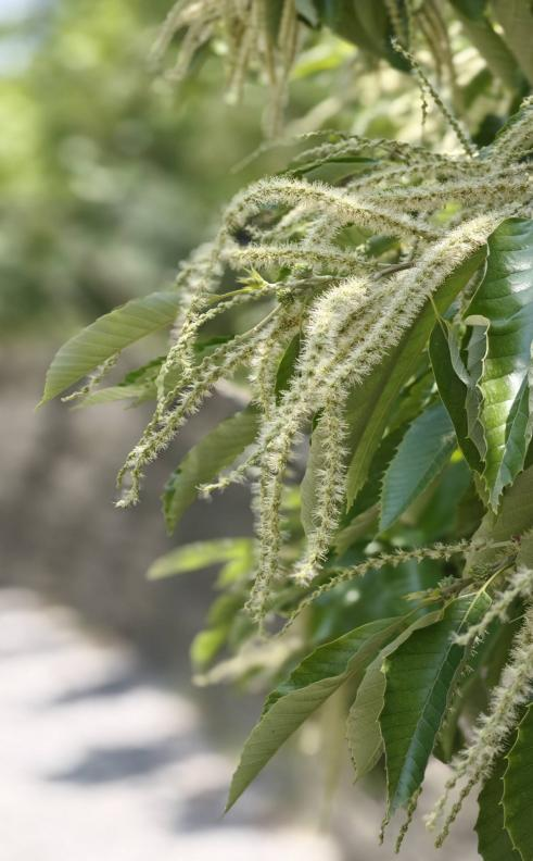 板栗大家都吃过,板栗花就不一定都见过了。每到盛夏,板栗树开花,花朵雌雄同株,雄花为葇荑花序,像毛毛虫一样挂在树梢,雌花一或数朵长在雄花序基部的总苞内。栗子花的味道和石楠花很像,都属于不可描述的“生命的味道”,其味道是复杂的挥发性化合物共同作用,主要来自酯类和烯萜类。