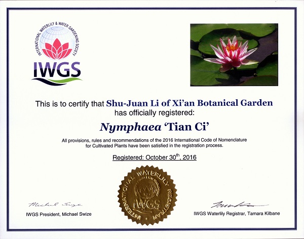 2017年11月24日,国际睡莲新品种竞赛(2017 New Waterlily Competition)结果揭晓,由我园李淑娟副研究员选育的睡莲新品种‘天赐’(Nymphaea ‘Tian Ci ’)荣获2017年最佳耐寒睡莲新品种季军和最受大众喜爱奖两项国际大奖。