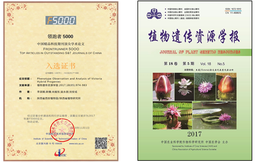 近日,科技部中国科学技术信息研究所公布了2017年度“领跑者5000-中国精品科技期刊顶尖学术论文”(简称F5000),我园李淑娟、尉倩、尚煜东、吴永朋、刘安成等作者撰写的论文《王莲(Victoria)杂交后代表型观察分析》入选。该论文发表在2017年的《植物遗传资源学报》(第18卷第5期),首次对王莲杂交后代的10个主要性状的分离情况进行了观察并数据化统计分析,初步揭示了王莲杂交后代的性状分离特点,为王莲遗传图谱构建及基因定位打下了基础。