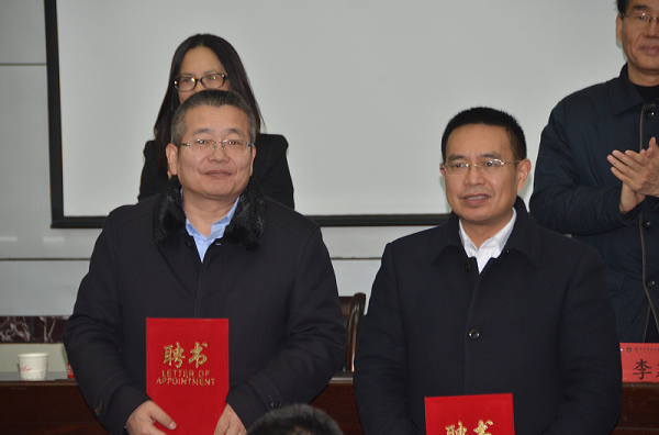 陕西省西安植物园岳明主任(左一)与陕西省中医药大学领导唐于平(左二)代表全体委员接受聘书