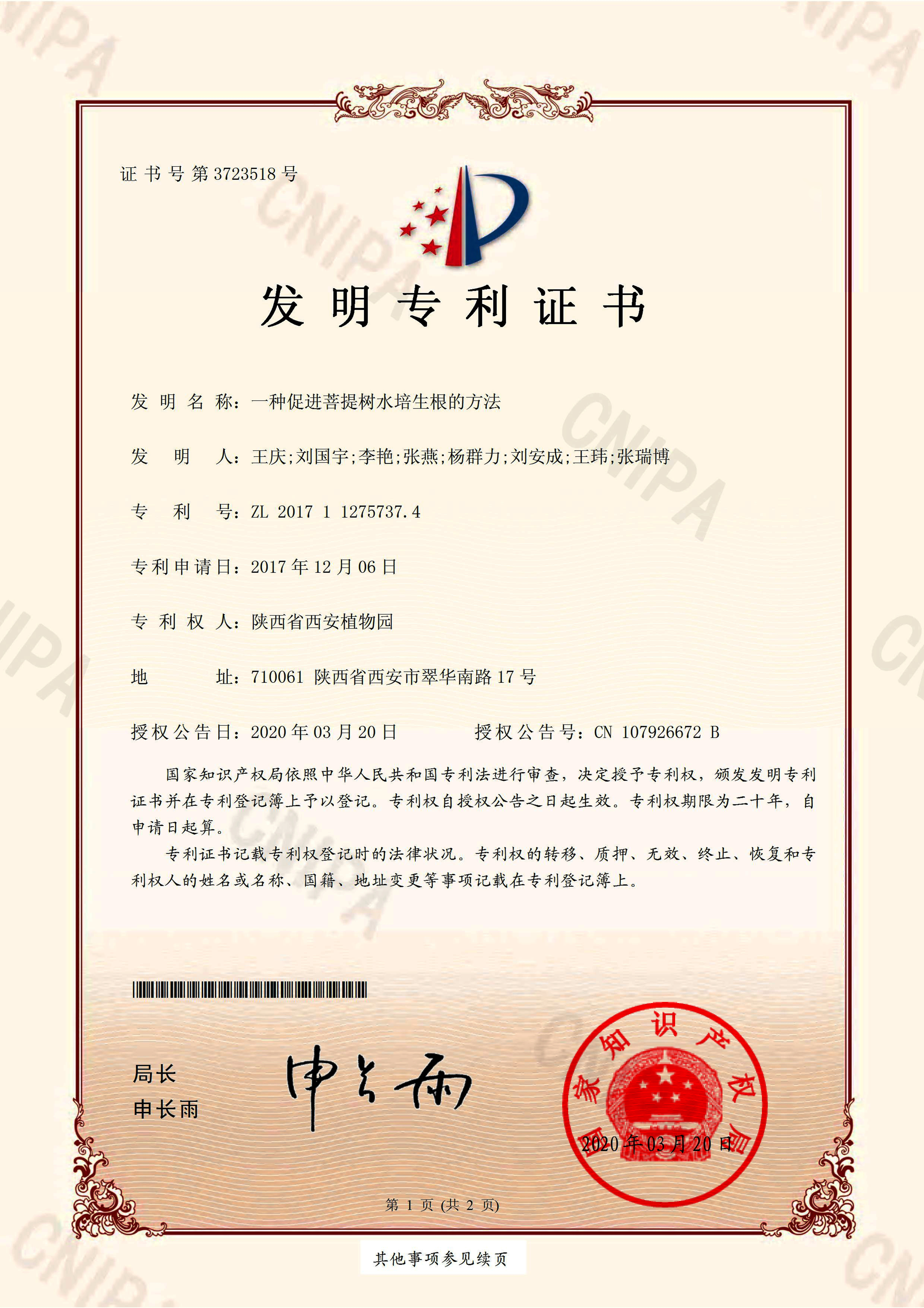 近日,由陕西省西安植物园王庆、刘国宇、李艳等科研人员完成的 “一种促进菩提树水培生根的方法”获得国家发明专利授权(专利号: ZL 2017 1 1275737.4)。