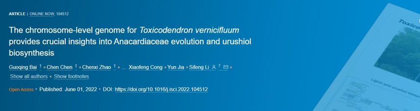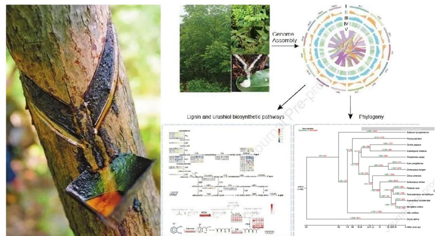 对此,陕西省西安植物园李思锋研究员团队联合华大基因、西安交通大学等多家单位协作,利用基因组学、转录组学和代谢组学技术,全面筛选并发现了漆树中与漆酚和木质素产生有关的候选基因。首次获得并公开发布了染色体级别的漆树参考基因组序列,并揭示了漆树木质素及漆酚合成相关的代谢通路。研究结果对漆树漆酚的生物合成、漆树分子育种和工程育种具有重要的指导意义。该研究以题为“The chromosome-level genome for Toxicodendron vernicifluum provides crucial insights into Anacardiaceae evolution and urushiol biosynthesis”发表在Cell Press旗下交叉学科期刊iScience上。