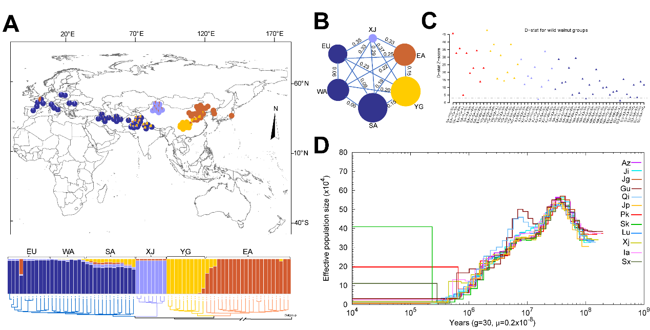 项目团队对世界范围分布胡桃属植物309个个体进行了重测序,其中包括55份核桃近缘种、98份野生核桃、70份地方品种和86份栽培品种。系统发育树表明,在核桃属植物中,核桃组(Dioscaryon)样品为单系分支。核桃种质资源遗传多样性的核心区域是青藏高原和喜马拉雅山脉附近的中国西南部和亚洲南部,喜马拉雅山脉的隆起被是导致核桃种群动态变化的主要因素。核苷酸多样性、连锁不平衡、单核苷酸多态性和插入/缺失方面的基因组变异模式揭示了核桃的驯化和选择足迹。
