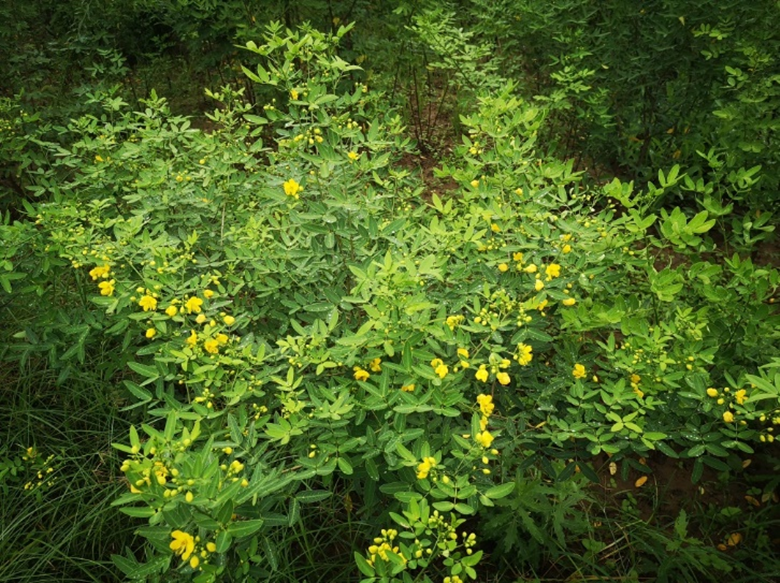1.‘金蝶’伞房决明(Senna corymbosa‘jindie’)经多代实生繁殖选育而来。该品种为半灌木,小枝密集,株型紧凑,分枝性好,单株萌蘖能力强;小叶长3 cm~5 cm,宽0.8 cm~1.5 cm;花色鲜黄,花期长,8月上旬初花,9~10月盛花,花量大。喜光,耐寒,耐干旱贫瘠,耐修剪,不择土壤,忌水涝。适宜在陕西关中及相似生态区推广应用。