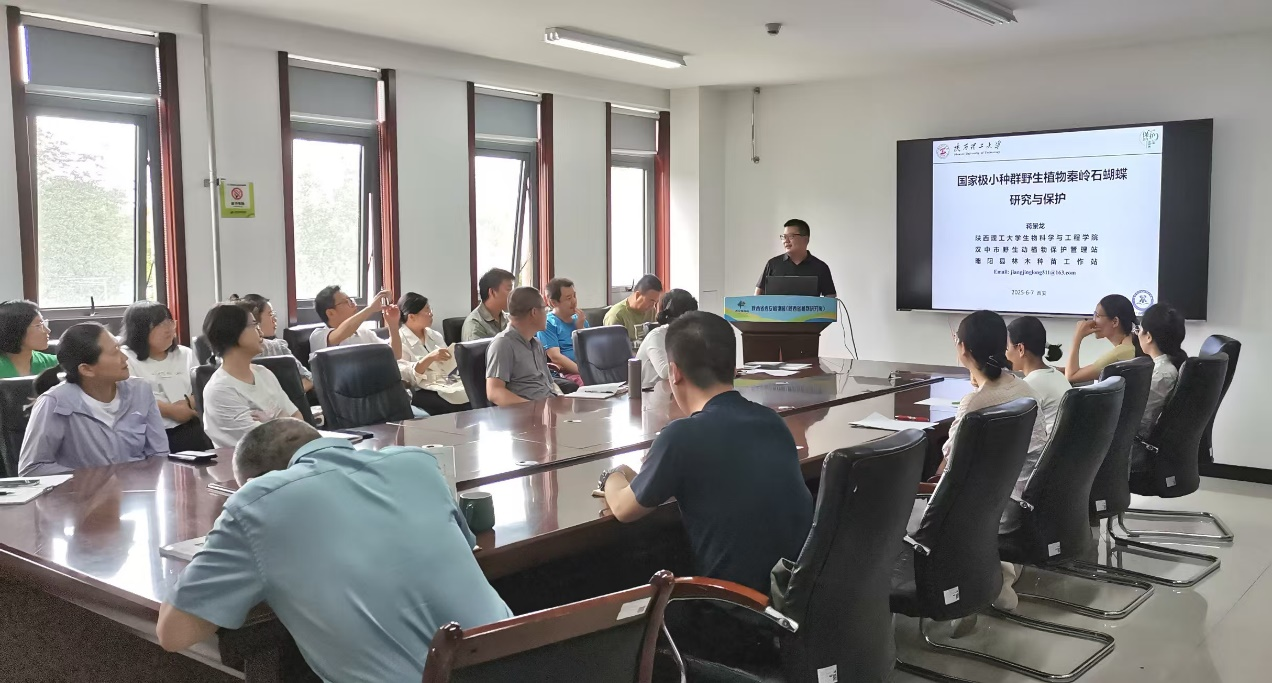 6月7日下午,陕西理工大学生物科学与工程学院博士生导师蒋景龙教授来我园开展野生珍稀濒危植物学术交流活动,并作题为《国家极小种群野生植物秦岭石蝴蝶研究与?;ぁ返淖ㄌ獗ǜ妗1ǜ婊嵩诨ǔ扒セ嵋槭揖傩?,约45名科研人员放弃周六休息时间踊跃参会交流,报告会由岳明主任主持。