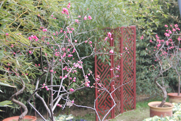 千百年来,梅花承载和寄托着中华民族独特的情感,凭着傲霜耐寒的特性成为中国人品格的象征,深受国人喜爱。元代诗人杨维帧咏之:“万花敢向雪中出,一树独先天下春?!本褪敲枋雒坊ú晃费虾?,独步早春,不屈不挠的精神和顽强意志。此次梅花展主题多取材于中国传统文化中梅花的意象,其中最令人震撼的是把松、竹、梅配置在一起,苍松、翠竹相映成趣,再将曲干虬枝、含而待放的梅花枝配以其中,有“岁寒三友”凌风独茂之感。展区内粉皮宫粉、小绿萼、美人梅、银红、飞绿萼等不同品种的写意盆景争奇斗艳,配以连翘、桃花、郁李等其他植物,在带给游客浓浓春意的同时,也更鲜明地烘托出梅花文化主题。此外,为了多角度全方位的展现梅花之美,展区内