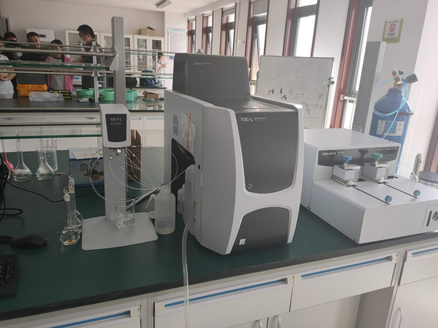 科研人员在工程师指导下实际操作总有机碳分析仪(岛津TOC-L CPH)