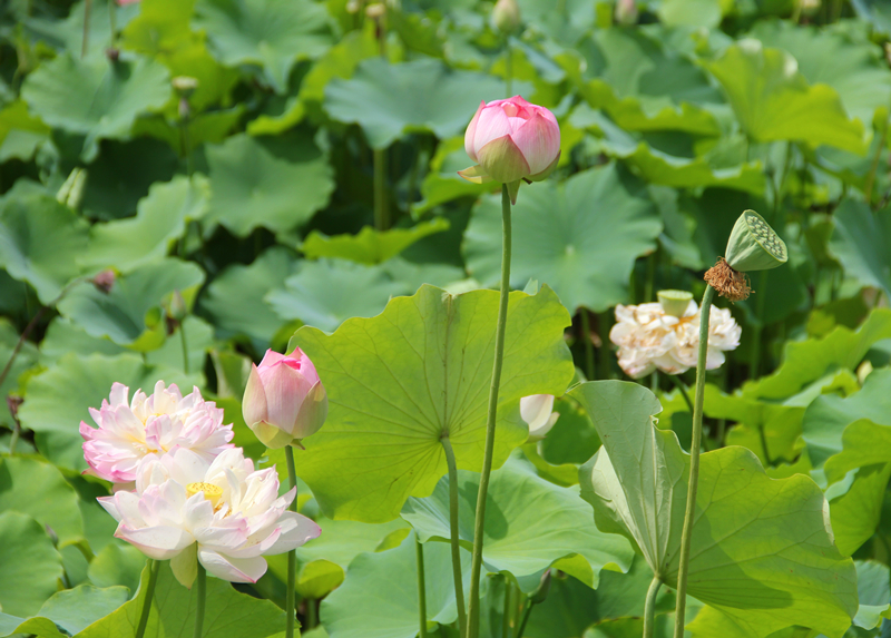 “接天莲叶无穷碧,映日荷花别样红”,一句话使得植物园中的荷花美景乍然出现在眼前。走进植物园,循着荷花特有的清香,便可找到绽放荷花的倩影。水景园中的荷花无论是含苞时的娇羞,初绽时的稚嫩,怒放时的舒展,每一眼都让你停留在无边美景与绚烂花海勾勒出的秀丽画卷中。一阵阵微风吹过,清香袭人,荷花迎风摇曳,宛如仙女下凡,翩翩起舞。除了水景园里的荷花,在西大门水景园平台处还采用了盆栽和缸栽的形式组景,为游客打造了一处零距离观赏荷花的区域。