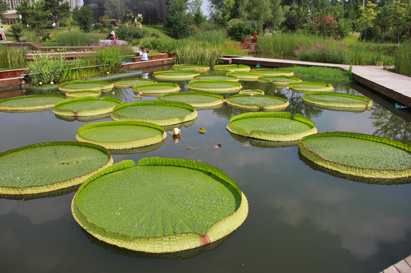 沿着水景园中曲折蜿蜒的木质水上栈道漫步,会发现几枚大大的叶片铺在水面,它就是今年夏季花展的主角——王莲。其叶片最大直径可接近3米,每个叶片最大可负重约70公斤,被称为“水中大力士”。王莲的观叶期长达150天,花期则仅有3天。第一天傍晚时分初开为白色,次日太阳升起闭花下沉,到傍晚再次升出水面开花,变成粉红色。第三天深红色的花朵在中午前凋谢并沉入水中。由于王莲这一奇特的特性,也被人们称为“善变女神”。