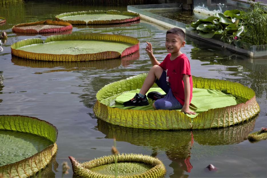 在植物园的水景园内,参加体验活动的8位45kg以下的小朋友,在工作人员的帮助下,按照次序一个个坐在巨大的王莲叶片上,摆出各种可爱的造型,家长和摄影爱好者们纷纷按下快门,记录下孩子们这一神奇且难忘的瞬间。