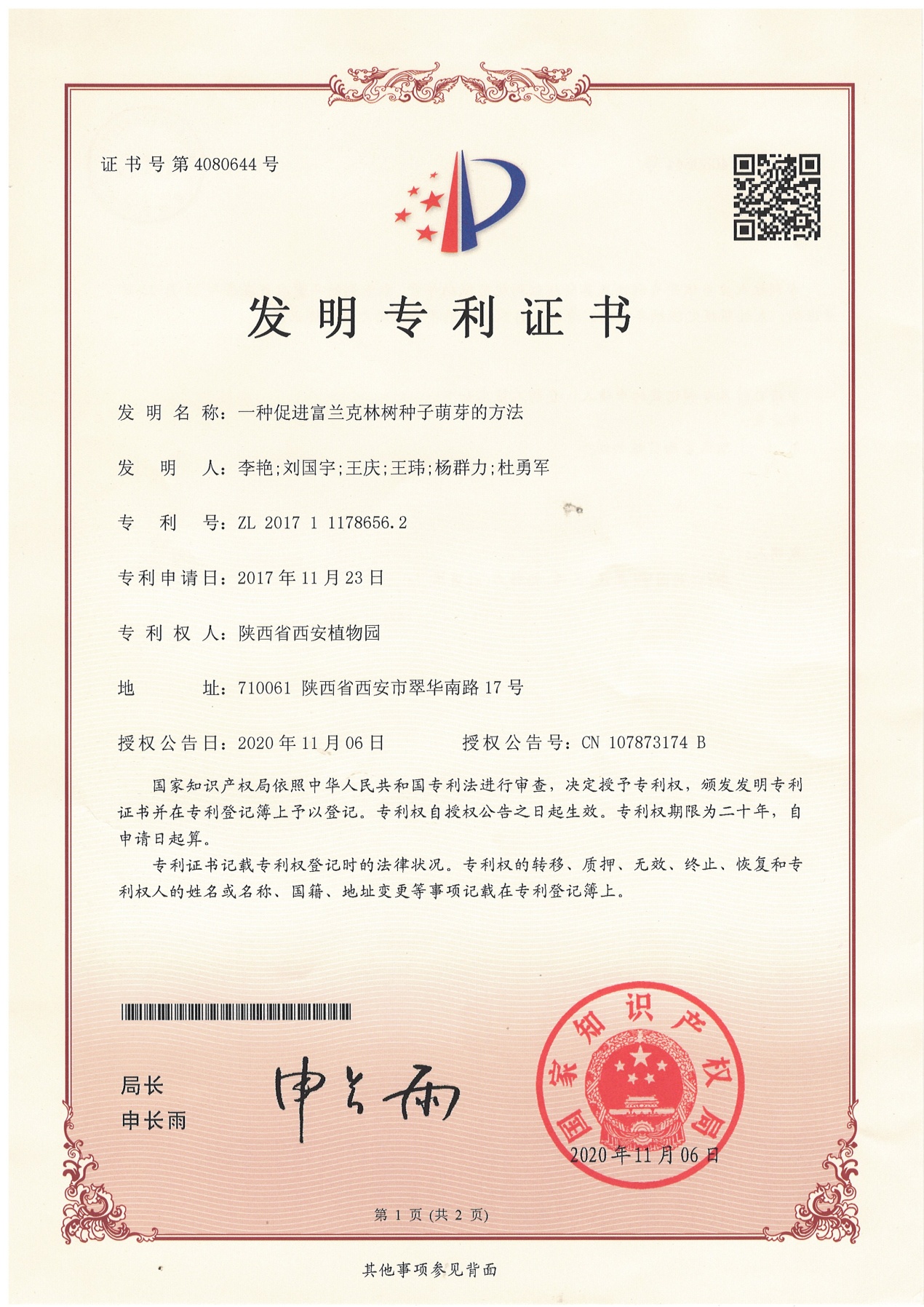 近日,由陕西省西安植物园李艳、刘国宇、王庆等科研人员完成的“一种促进富兰克林树种子萌芽的方法”获得国家发明专利授权(专利号: ZL 2017 1 1178656 .2)。