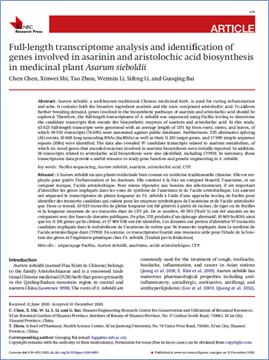 该成果以Full-length transcriptome analysis and identification of genes involved in asarinin and aristolochic acid biosynthesis in medicinal plant Asarum sieboldii为题发表于国际期刊Genome。本项目受国家自然科学基金(31800554、31800259)、陕西省科学院青年联合创新专项(2017k-12)的资助;课题组陈尘副研究员为第一作者,柏国清副研究员为通讯作者,西安交通大学医学部药学院周涛老师参与本项工作。