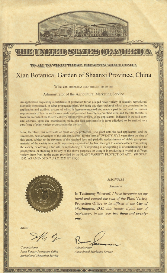 由陕西省西安植物园木本育种团队自主培育的玉兰新品种‘小璇’日前通过美国农业部植物多样性?;ぐ旃?U.S. Department of Agriculture PLANT VARIETY PROTECTION OFFICE)材料审定,获得新品种权证书(品种权号202000425)?;竦檬谌ê?,“小璇”玉兰将正式进入美国花卉市场。