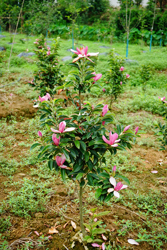 玉兰新品种‘小璇’是2008年春季人工杂交后获得的仅一粒杂交种子长成的唯一一株杂交实生苗,其母本为木兰科木兰属落叶品种星花玉兰‘睡莲’(Magnolia stellata‘Waterlily’),父本为含笑属常绿品种阔瓣含笑‘新含笑’(Michelia platypetala ‘Xin Hanxiao’)。2013年7月上旬杂交苗第一次开花,花量逐渐增大?!¤窭加肫浒咨ǖ哪副竞透副静煌ㄉ凵?,并且株形更为紧凑矮小。8年生种苗株高仅为1.6 m,是近缘种‘红笑星’玉兰同龄种苗株高的2/5,叶片更小,夏季花期更长,因此更具观赏性。2016年6月22日在国际木兰学会进行了国际登录,2019年07月24日获国家林草局新品种授权(品种权号20190045)。是迄今叶形和株形最小,花朵最密集的玉兰属新品种,为盆栽玉兰的首选品种。