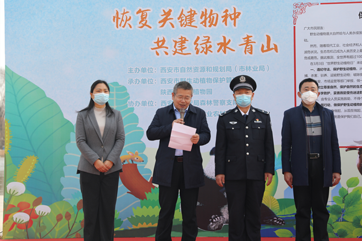 2022年3月3日,以“恢复关键物种、共建绿水青山”为主题的西安市第九个“世界野生动植物日”宣传活动在陕西省西安植物园举行。该活动由西安市自然资源和规划局(市林业局)主办,西安野生动植物?;す芾碚竞蜕挛魇∥靼仓参镌傲铣邪?。国家林草局驻西安专员办副专员贾永毅、西安市自然资源和规划局(市林业局)局长冯涛、西安市雁塔区农业农村和林业水务局局长于建国、陕西省西安植物园主任岳明等人出席并讲话。西安市野生动植物保护管理站站长张登仓主持活动。