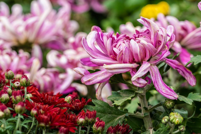 本届花展以“秋韵流芳·喜迎二十大”为主题,共计展出60多个品种,以及大立菊、悬崖菊、塔菊、多头菊、案头菊等多种艺菊造型,结合各类菊科花卉和其他应季花卉,总花量约为6万余盆。今年花展以植物园现有生态景观为依托,整体布局采用传统与现代景观艺术相结合的手法,布置了5个主要展区,分布于西大门、水景园、本草园、藤蔓园、百卉园等区域。各展区运用园林造景等多种形式将菊艺盆景、造型菊、悬崖菊及各色时令花卉等结合场地特点布置,充分展现出菊花造型艺术和充满菊韵的秋意美景。