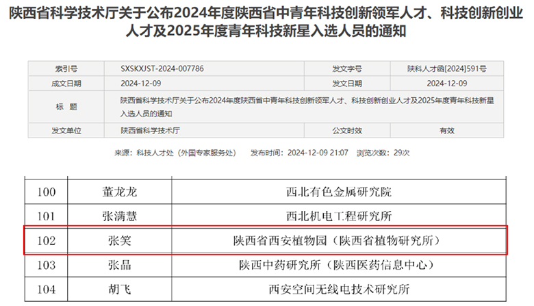 近日,陕西省科学技术厅公布了《2024年度陕西省中青年科技创新领军人才、科技创新创业人才及2025年度青年科技新星入选人员的通知》(陕科人才函〔2024〕591号),陕西省西安植物园张笑博士入选2025年度陕西省青年科技新星。“十四五”以来,西安植物园已连续有4名青年科研人员入选陕西省青年科技新星,截止目前,青年科技新星总人数达8名。