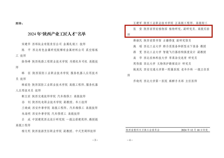近日,为进一步弘扬劳模精神、劳动精神、工匠精神,营造尊重劳动、尊重人才的社会风尚,树立典型、表彰先进,陕西省教科文卫体工会委员会发布《关于命名 2024 年“陕西产业工匠人才”的决定》(陕教科文卫体工发〔2024〕40 号),我园副研究员、高级实验师张莹同志荣获2024年“陕西产业工匠人才”称号。
