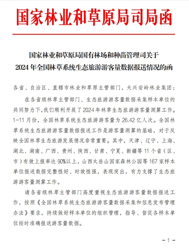 全国林草系统生态旅游游客量数据报送工作是游客量测算的基础,对于反映全国林草生态旅游发展情况非常重要。2024年1-11月份,全国林草系统生态旅游游客量为26.42亿人次。陕西省西安植物园作为是国际植物园?;ち顺稍钡ノ缓椭泄参镌傲死硎碌ノ恢?,积极响应陕西省林业局牵头组织的游客量数据报送工作,有力支撑了生态旅游游客量测算工作。