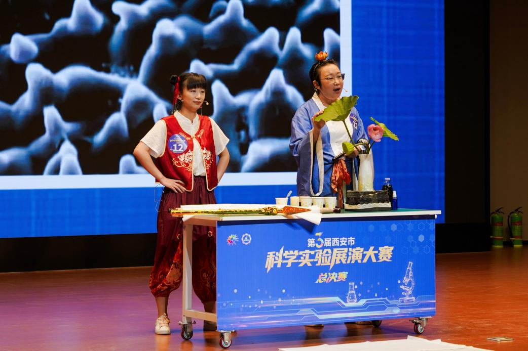 西安植物园科普宣教中心团队的丁芳兵、王雅婧共同呈现了题为《荷叶超疏水机理及其应用》的实验展演并荣获一等奖和最佳实验创意奖。该展演巧妙地将神话剧情与实验相结合,用通俗易懂的方式讲述了荷叶的特殊构造,通过有趣的实验向我们生动诠释科学家如何在纳米级尺度进行超疏水材料等的研究。她们以活泼生动的表演形式,将复杂的科学知识转化为通俗易懂的科学剧场,受到评委和观众的高度评价。