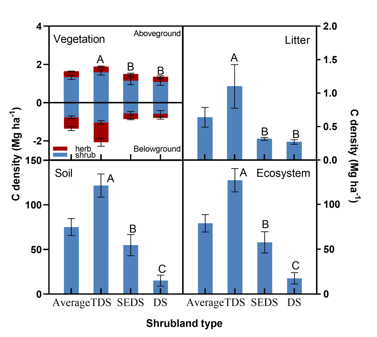 图1?我国北方不同灌丛类型生态系统碳密度及其组分特征