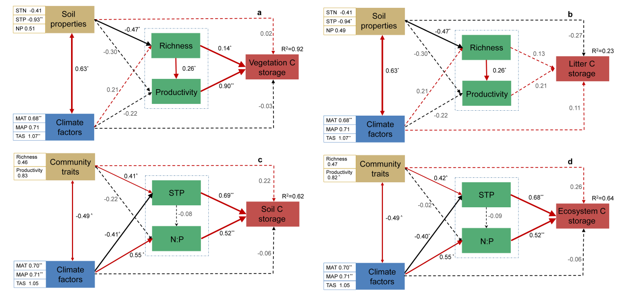 图2 土壤特征、气候因子和植物群落性状对植被碳密度(a)、凋落物碳密度(b)、土壤碳密度(c)和生态系统碳密度(d)的影响路经