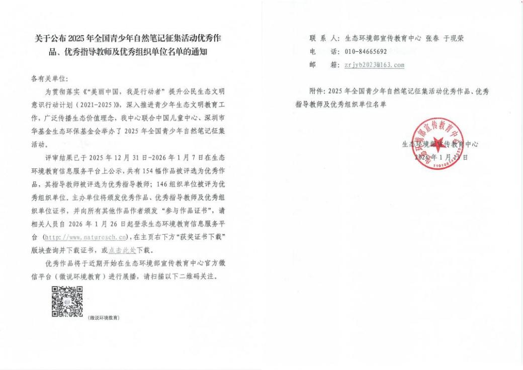 近日,由生态环境部宣传教育中心举办的“美丽中国,我是行动者”2025年全国青少年自然笔记征集活动获奖名单公布,陕西省西安植物园凭借出色的组织工作及对青少年生态文明教育的积极推动,获评“优秀组织单位”称号。